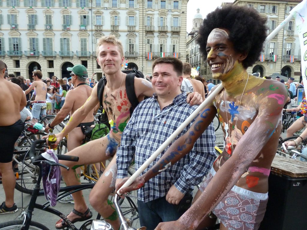 An elderly clothed couple looking on serenely while surrounded by, and talking to, naked and topless WNBR participants. The naked woman cycling happily beside the clothed woman along the protest route together; the fully uniformed police officers cycling happily and peacefully within the group of naked riders. These are gorgeous little vignettes of tolerance and co-operation within a mass protest.