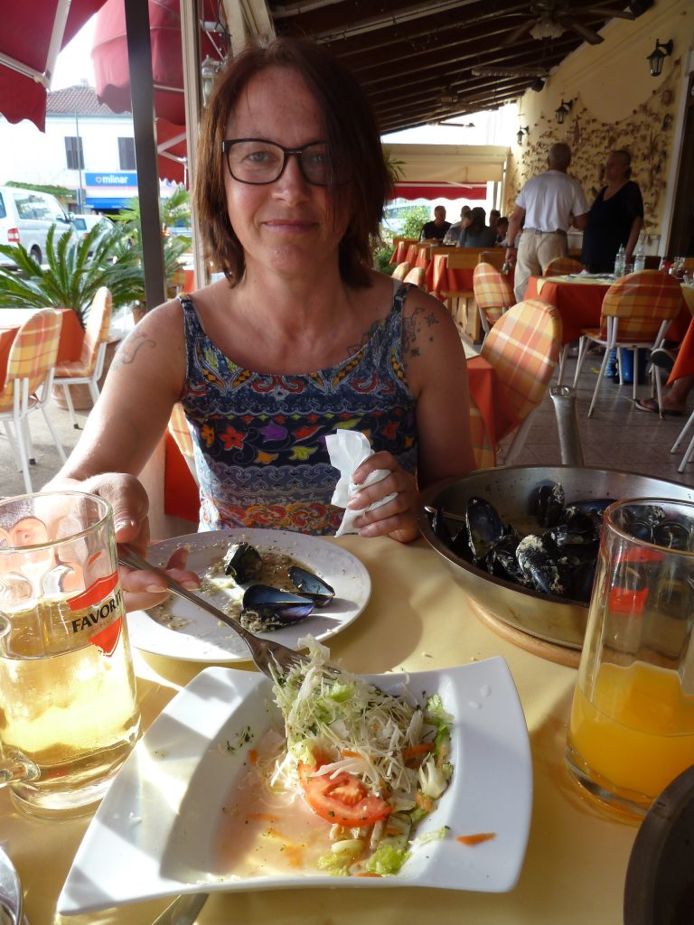 Let’s start with the positive. The Adriatic coastline around Vrsar, our camping destination, is quite simply beautiful. Steep Limestone clifflets, topped with a tufty layer of bright green and brown foliage, plummet into a clear blue sea. A small flotilla of differently sized, but mostly small, boats flit up and down the estuary, and between the pets-not-welcome FKK resort at Valalta and the pet- and dog-friendly FKK resort at Koversada. We have Polly the Collie with us so we opted for Koversada. The scenery gets a very good 9/10.