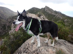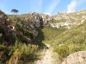 Finally we crested the ridge, with some relief and were able to look around and take in the view. The mediterranean now far below glistening grey and blue. On every other side, both grassy and sharp crestellated ridges tumbled toward the sea. We still had more height to gain, but the grunt was over, and the rest of the walk was undulating over the ridge. We descended to a col trying to avoid too many scratches from the spiky grass and sharp bushes which grew across the high and dry landscape. Stopping for a brief brunch and to admire the silent surroundings, we thankfully slaked our thirst from the water bottles. I’d long since given up on finding puddles for Polly to drink from and carried a lightweight and cleverly collapsible rubber water bowl for her. She came over as soon as she saw me pull it from the rucksack, and I had to struggle to get the water bottle open while she tried to lick the dry container impatiently. We were both feeling the heat and the exertion, even though we were lucky with the weather, as there was a layer of overcast clouds keeping the worst of the summer sun off our backs and heads.