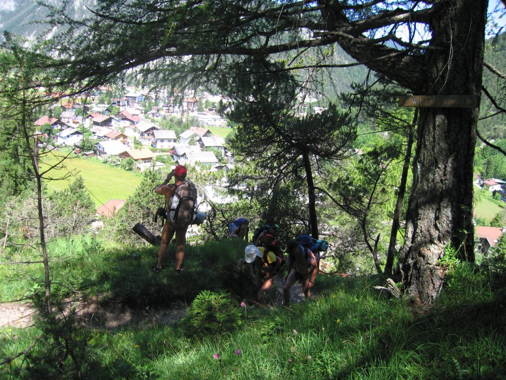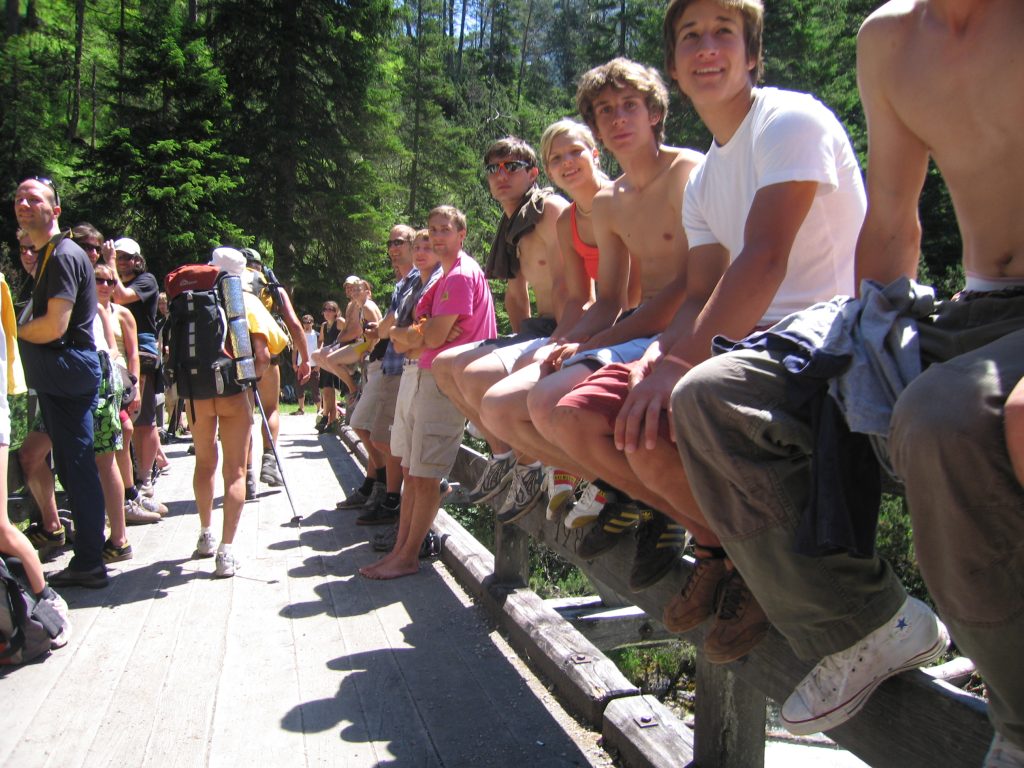 The clanging of a herd of cow bells rang through the air, slowly drowned by the noise of more than 100 young people cheering a boy crossing the river by walking across a Tyrolean traverse (a single rope strung across the gorge). This was a new experience for most of us, being naked in front of so many people, but we just took it in our stride and set off across the bridge. We walked past the lines of teenagers to a round of cheering and much jocularity, the entire group seemed very relaxed at our unexpected intrusion. A man ran after us to film us briefly, to ask us what we were doing, and looked almost disappointed when we answered “We’re just out for a pleasant walk.” On this baking hot Sunday in July we met many more people on the trail up the Karwendel valley. Mostly mountain bikers, with a mix of small walking groups, families or couples, and individual sporty types too.