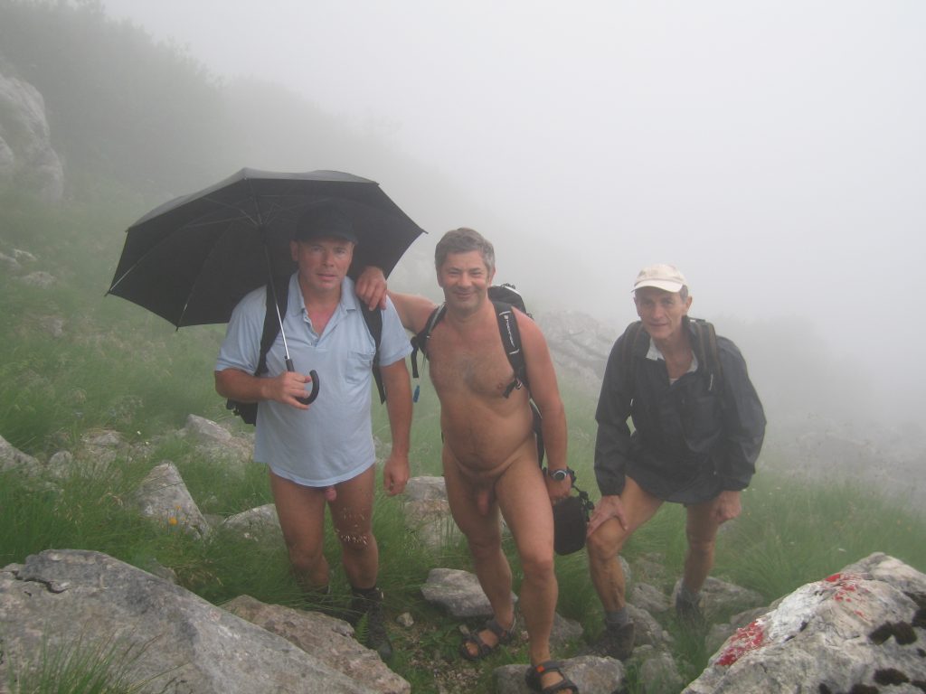 Wending our way along the faint path, among the heather and high mountain flowers, we crossed the col and descended to the hut on the other side. No milk to be had here, surprisingly, so we had hot tea instead. At this point our party was joined by the erstwhile Sepp, the nacktbergsteiger, (naked mountain climber), from Austria, who arrived in the middle of the rain storm which started fortuitously just after we had arrived at the hut. After a break we set off once more and followed the long and steep track zig-zagging down the far side of the mountain. Some of us naked, some half-dressed and some well covered from the weather, the rain didn’t let up. In fact the rain now set in for the night, and it was a rather bedraggled looking little group which turned in for tea and cake at the gasthof in the valley. Once in the valley we met up with John and Sylvie once more, who had found a couple of extra people. Pat and Claudie had arrived while we’d been crossing the mountain, having finally made the decision to join us, and had driven the 1,000 km to do so – they were to have a short but interesting trip. The group was now up to it’s full complement of nine naked enthusiasts. It was still raining, so we sojourned to a very comfortable student accommodation apartment in Bad Ischl, and chilled out, (and warmed up), for a while.