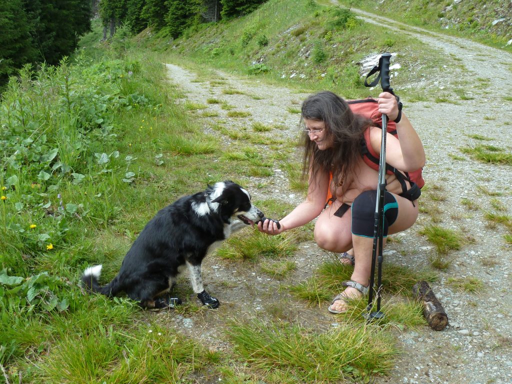 Meanwhile the rest of the troupe headed off to do the first day’s tour without me, ably lead by Pierre. Having fixed up Sandra with various chemicals and the prerequisite health insurance paperwork, we headed for a vet finally finding one in Schladming. It turned out that Polly’s limping, was due to her paws being rubbed raw and sliced partially open, probably because of her pads being softened by the wet ground and then the water in the river, followed by madly rushing around over the rocks after sticks all day long. So it was doggie-shoes for all four of Polly’s paws, (she did look fairly funny, if a bit confused), and at least the rest of the day off, and a return to the hut for a swim and some chill-out time.