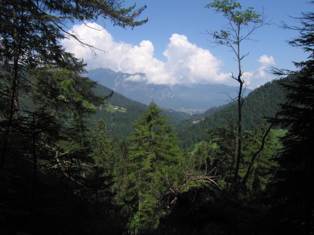 Meanwhile a couple had crossed in the opposite direction, and they reassured me that the route on the other side was simple enough, even for naked hikers, and nowhere as steep as this side, so I reluctantly followed the group. The ensuing walk across the high plateau-like col, before descending to the Inn valley at it’s narrowest point, was inspiring, and nearly made the perilous snow traverse worthwhile. The view from the far side, south onto high ridges overlooking the Inn valley was simply magnificent. We trudged down, losing all our hard gained height, to St. Magdelena, a gasthof which turned out to be closed, and then continued down the valley to the villages of the Inntal.