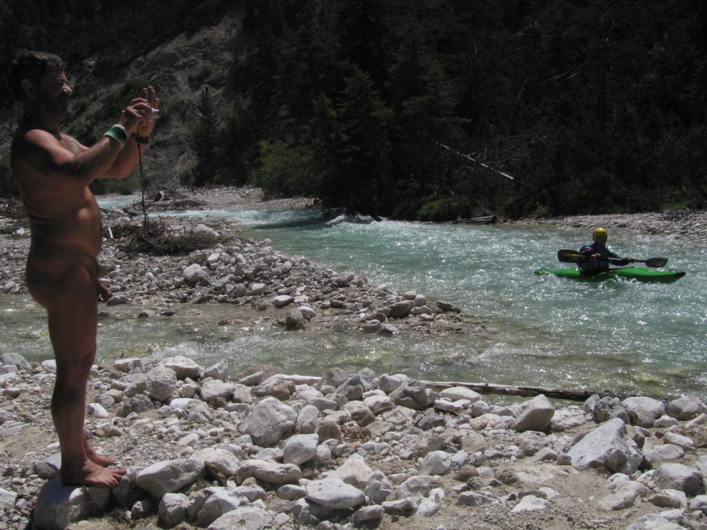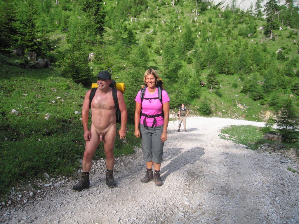 So we stopped and waited as she walked back up towards us and took a photo of these 2 naked men who had passed her on the track. “Don’t worry”, she said, “they won’t get on to the Internet!”. “It really doesn’t matter”, we replied, “and may we take a photo too?”, “Of course!” she said. So Doug took a photo with my camera, of me standing next to the dressed girl with her friend behind, at which point 2 lads approached from above at the same time, and took a photo of all of us together. Their boyfriends, I imagined, were probably a bit surprised to see their girlfriends talking to 2 naked men, but seemed quite relaxed too. It was such a simple exchange, both parties were simply recording an interesting encounter and enjoying the novelty. We carried on, and after some time reached the Hallerangeralm.